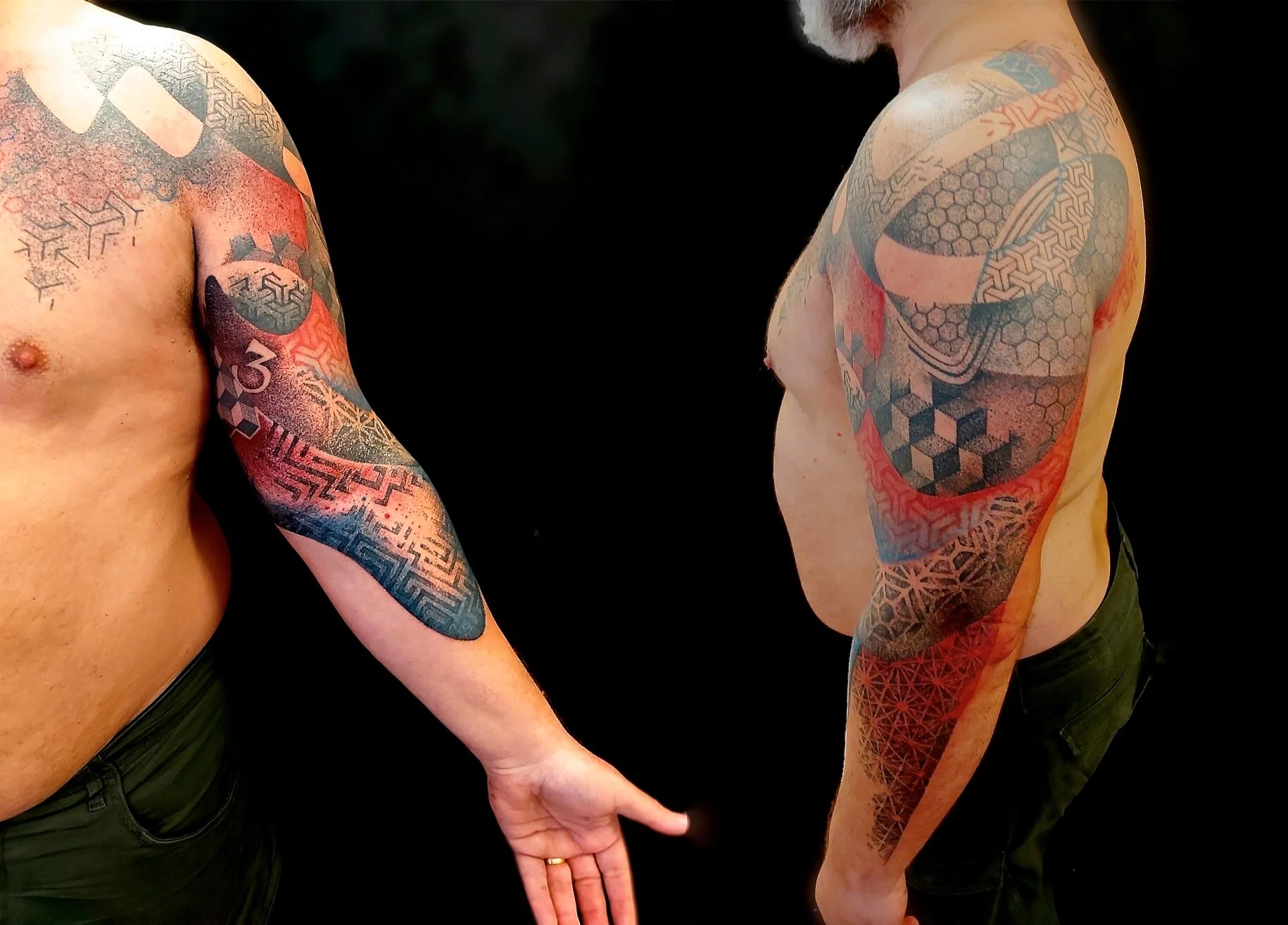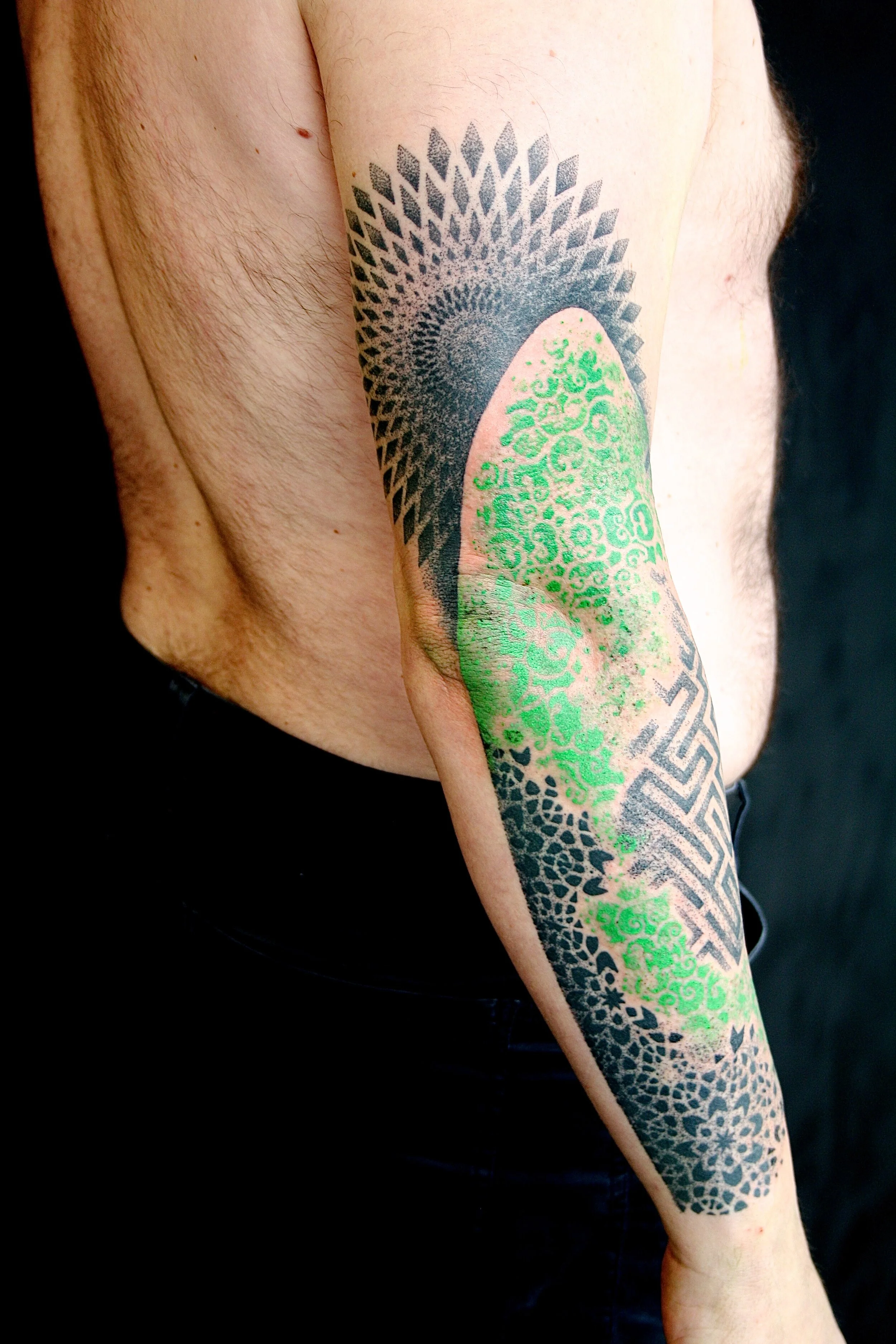 Maintenant, ombrages et aplats d’une masse relativement dense ne seront pas, d’un tatoueur à l’autre, encrés de la même manière, tantôt réalisés de façon plus brutale et irrégulière, tantôt plus précise et harmonieuse, tout cela selon le style et le caractère que l'artiste souhaitera donner à son oeuvre.